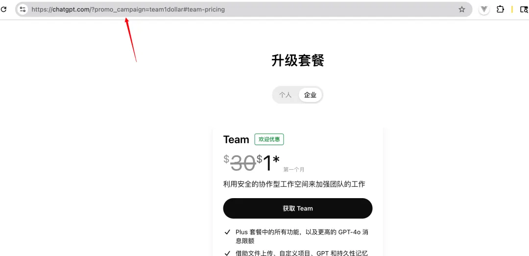 https://chatgpt.com/?promo_campaign=team1dollar#team-pricing官方活动说明地址(仅作参考,不可直接跳转优惠):
