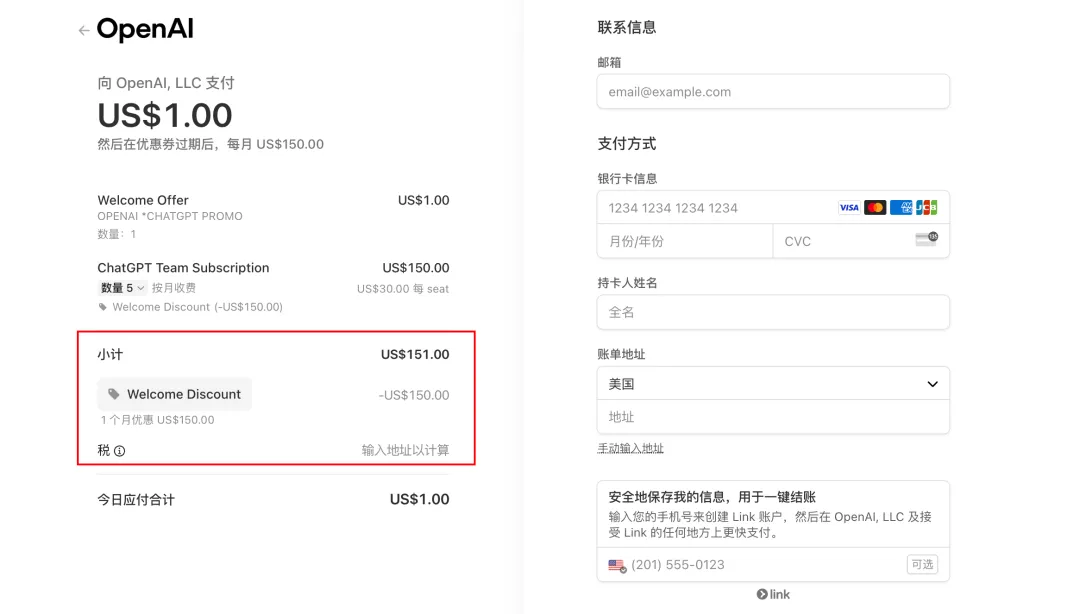 系统自动计算折扣:原价 30 美元/月/席位 × 5 席位 = 150 美金,首月立减 149 美元,只需支付 1 美元。