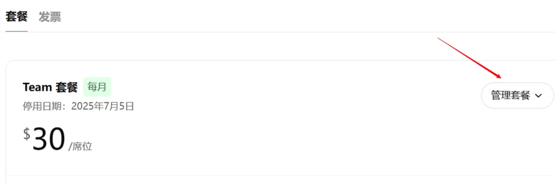 - 在结算页面中会显示当前订阅详情,找到 “管理套餐” 按钮。