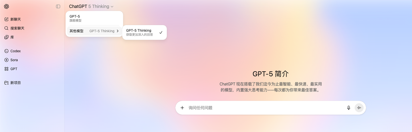 GPT-5 统一路由:GPT-5 已统一模型并启用智能路由,系统会根据请求自动调度相应能力的子模型,用户无需手动频繁切换。