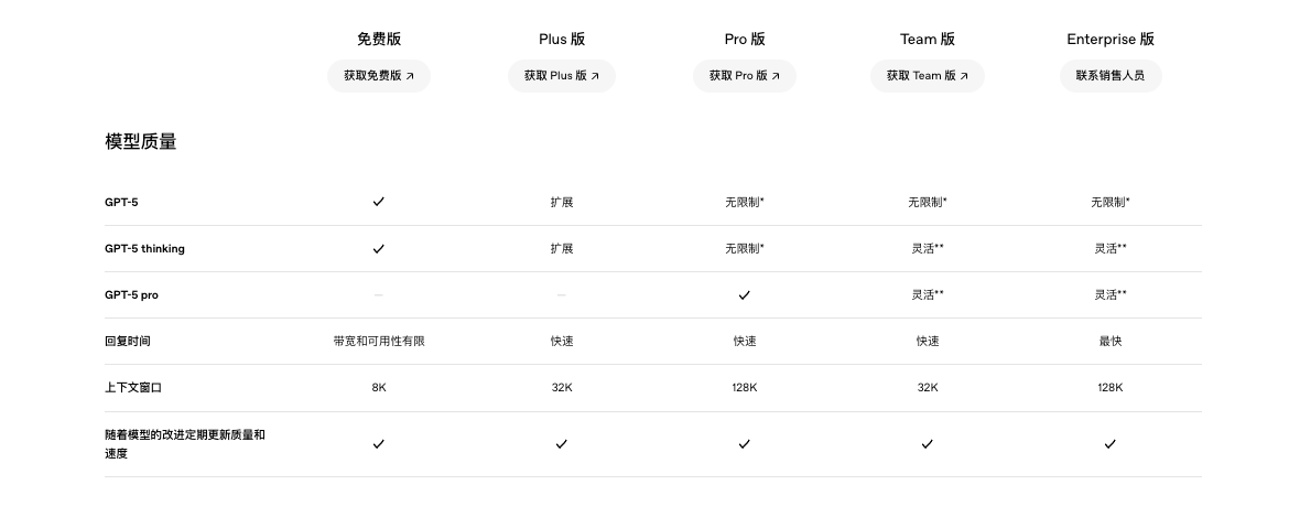 - Pro 用户:无限制 使用 GPT-5,并可使用 GPT-5-Thinking-Pro。