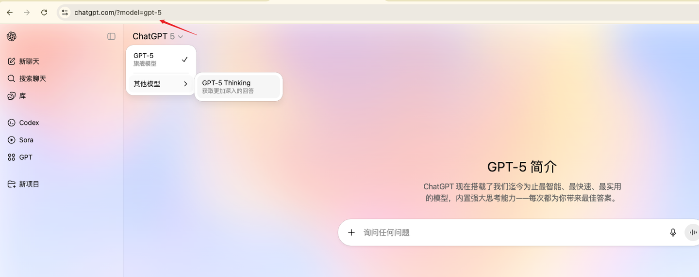 ?model=gpt-5或?model=gpt-5-thinking(注意:并非所有界面/版本都支持此参数)。 - 若仍无效,请以官方渠道或帮助文档为准,或尝试在不同设备/网络上登录确认。