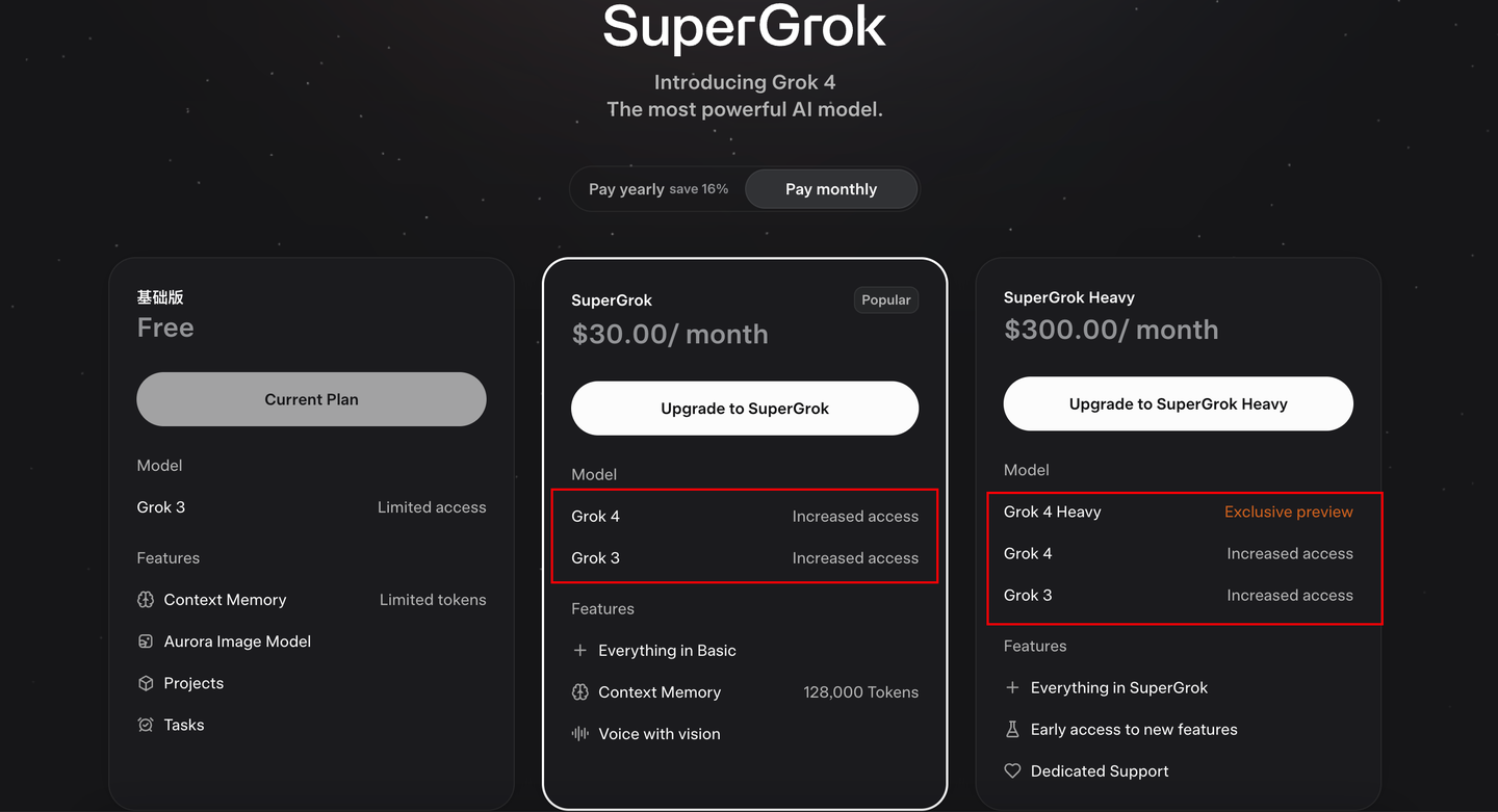 - 30美元/月:基础版,可使用 Grok4(标准模型)