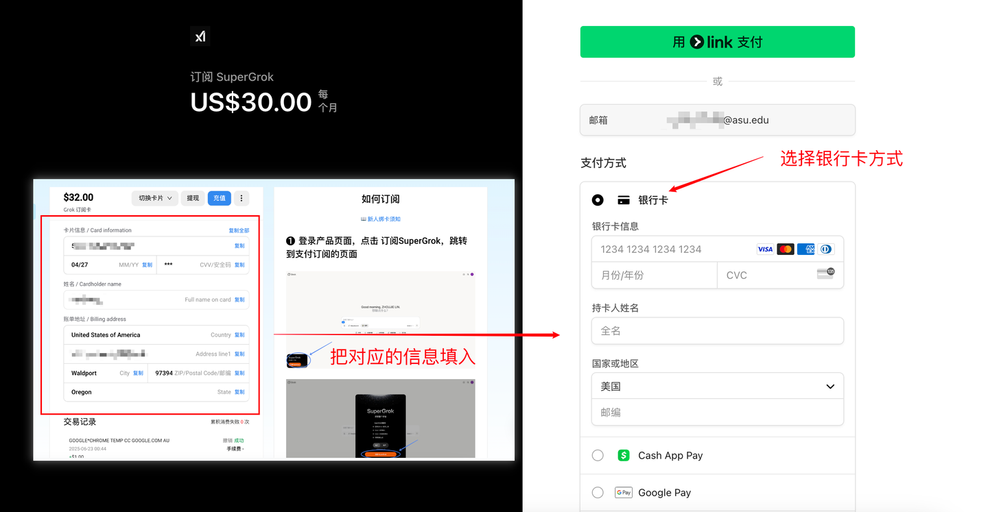 - 绑定完成后,将卡号信息填入 grok.com 即可支付