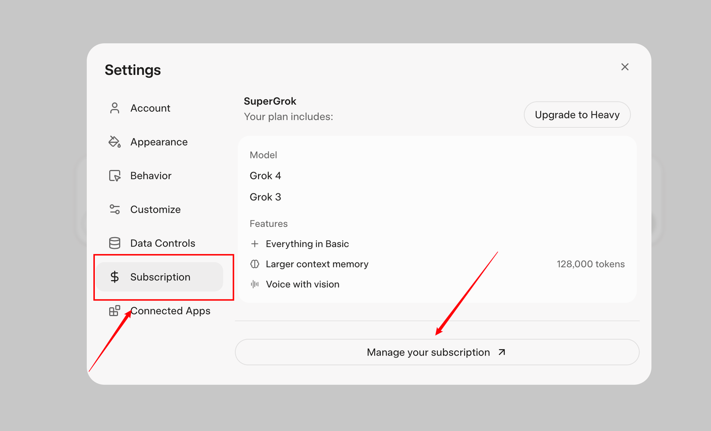 确认支付完成后,即可在 Settings → Subscription 中看到 SuperGrok 状态。