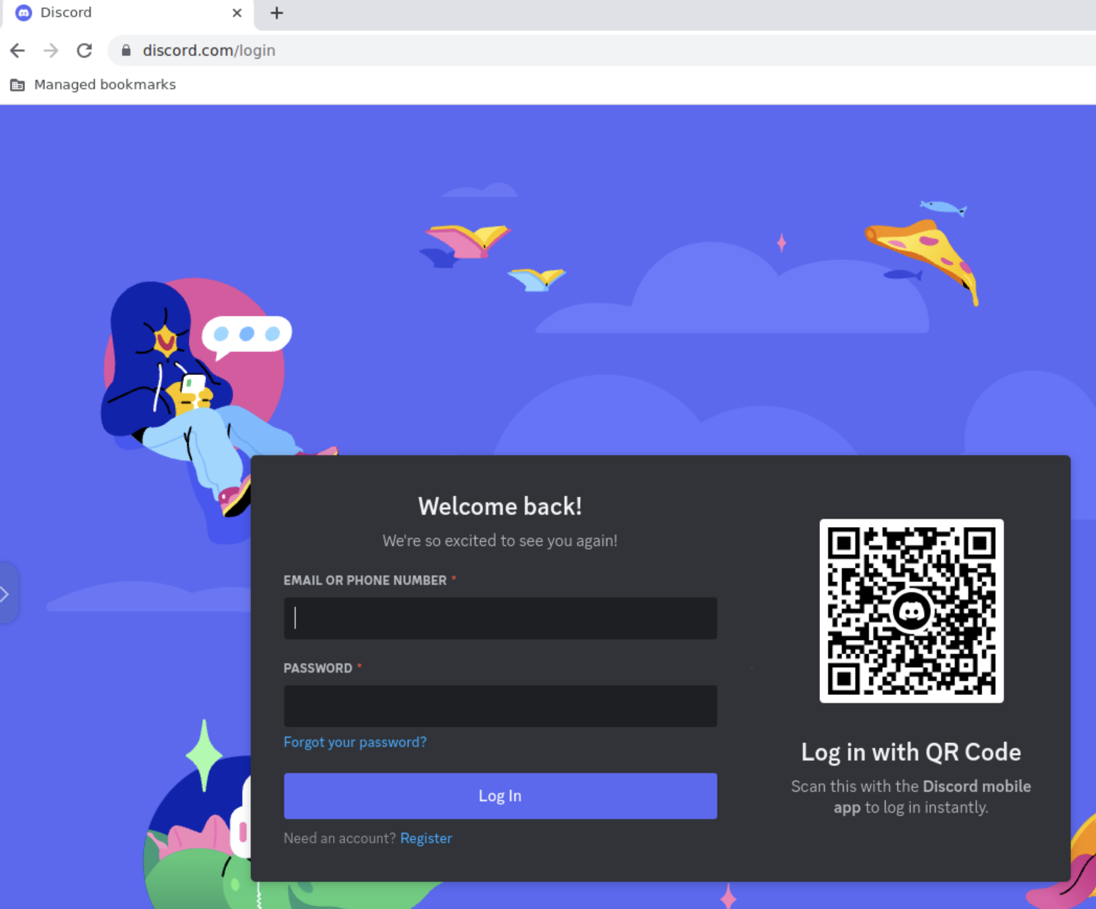 首先,在远程浏览器中输入 Discord 官方网址: 👉 https://discord.com/login (opens new window)