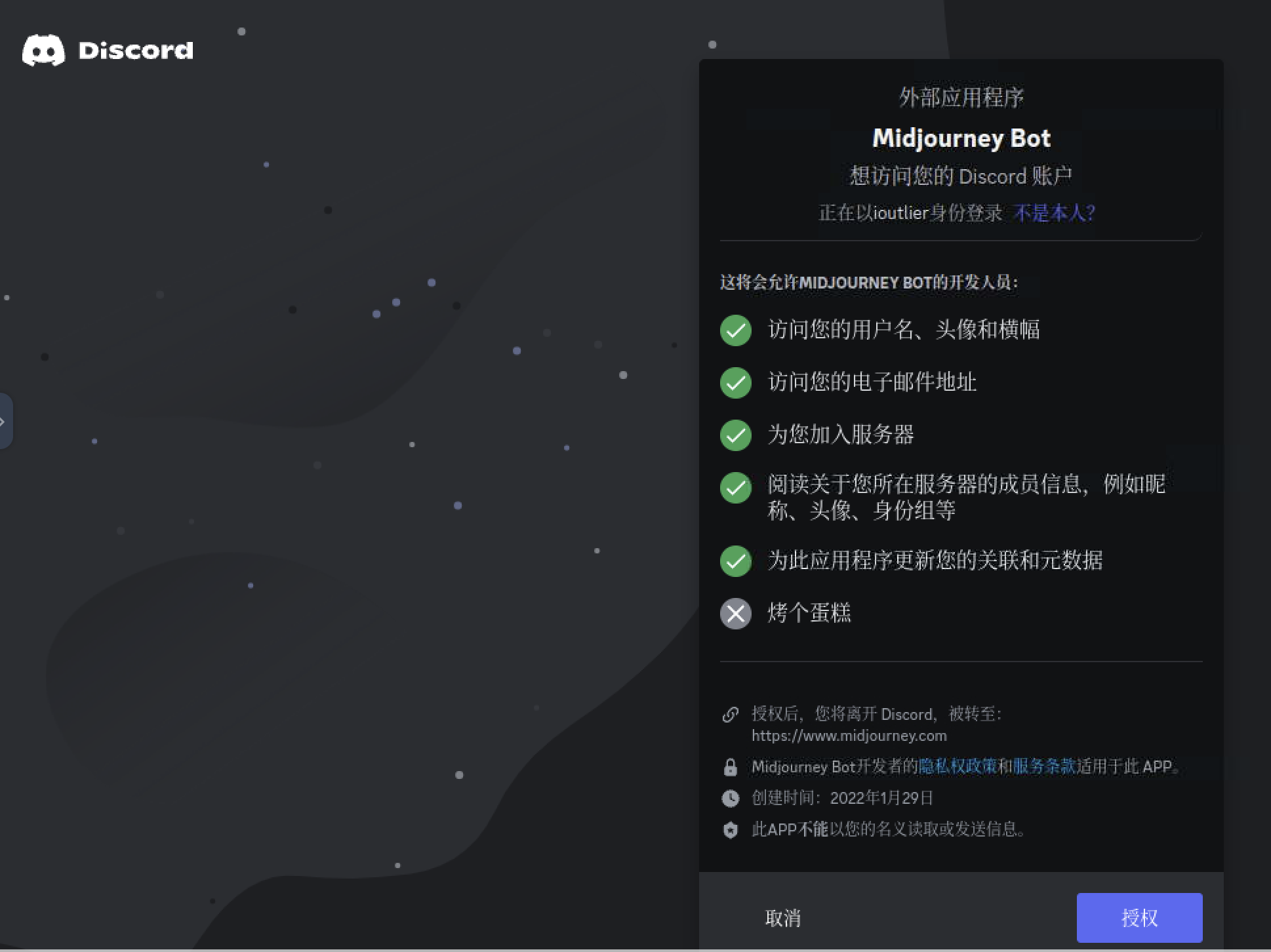 随后页面会跳转至 Discord 授权界面,点击授权即可登录 Midjourney 平台。