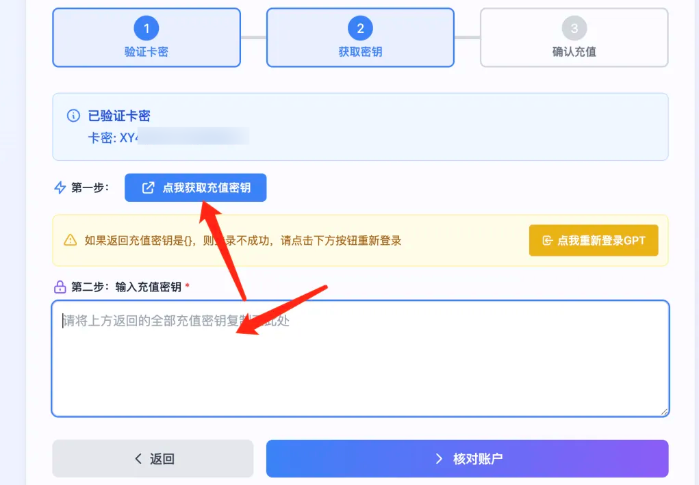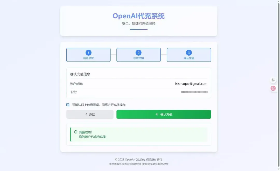 登录你的 ChatGPT 账号,系统会生成一个 充值密钥