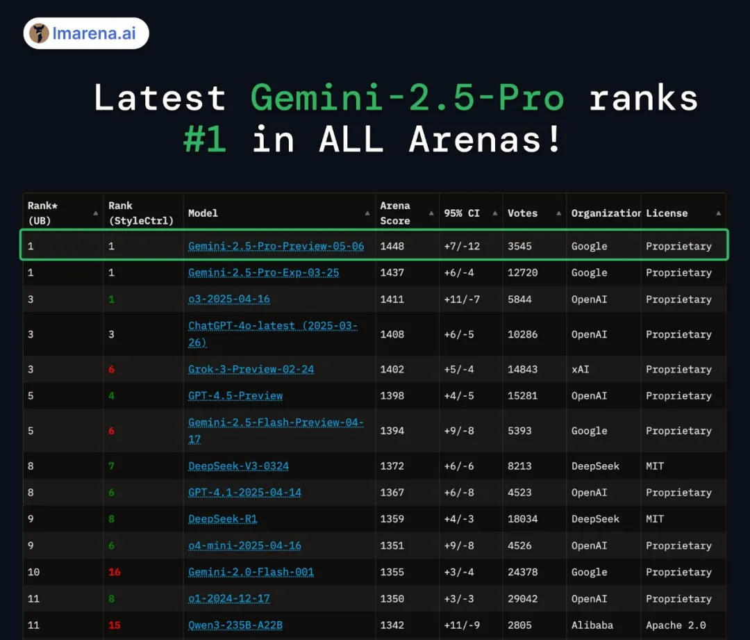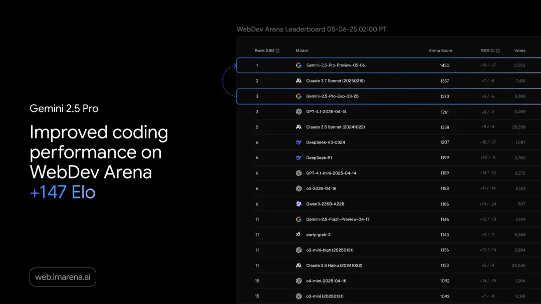 (LMArena最新编程模型性能排行:Gemini 2.5 Pro以显著优势登顶)